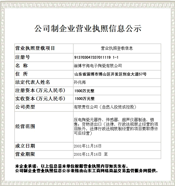 淄博宇海電子陶瓷有限公司位于淄博市博山開(kāi)發(fā)區(qū)創(chuàng)業(yè)大道57號(hào),始建于1966年,2001年11月由國(guó)營(yíng)淄博無(wú)線電瓷件廠改制為淄博宇海電子陶瓷有限公司。公司是生產(chǎn)壓電陶瓷元件的專業(yè)廠家,是中國(guó)電子元件行業(yè)協(xié)會(huì)創(chuàng)始會(huì)員、山東省先進(jìn)陶瓷創(chuàng)新創(chuàng)業(yè)共同體理事單位。