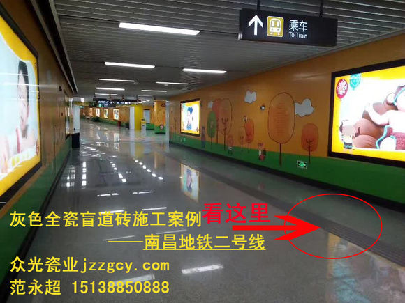就在今天這個喜慶的日子里,激動人心的時刻到了,南昌地鐵二號線在經過建筑工人們近一年的艱苦奮戰,已于近日峻工完成,今天就是試運日,開通儀式將在地鐵大廈隆重舉行。該地鐵線路施工所使用的盲道磚均采用的是眾光灰色全瓷盲道磚,施工前期使用的大部分規格為400*400*20,后期有使用少量300*300*20的規格。眾光灰色全瓷盲道磚不只應用于南昌地鐵,北京地鐵、鄭州地鐵、武漢地鐵等國內許多城市的地鐵都采用的是眾光灰色全瓷盲道磚。眾光灰色全瓷盲道磚外觀大氣高雅,陶瓷材質防滑耐磨吸水率低,使用易清洗,是石材、塑膠、水泥、不銹鋼等材質不可比的。眾光盲道磚是按國家行業標準規定的盲道尺寸規格生產的,主要用于城市道路及火車站、汽車站、地鐵站臺、人行道上的鋪設,它是殘疾人指引行走無障礙的專用設施。