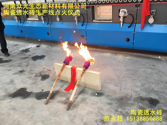 河南眾光生態新材料有限公司今年剛上的陶瓷透水磚新項目,經過四個月緊鑼密鼓的籌建,基礎建設已于7月中旬完工,8月初所有生產設備已安裝到位,并于今日早上9時許舉行了生產窯爐點火儀式,在點火儀式上修武縣各級領導進行了發言,并對我公司陶瓷透水磚項目寄予了厚望。公司老總袁福平手執火把點燃了天然氣窯爐的入火口,在熊熊的火光映照下,大家爆發出熱烈的掌聲,預示著眾光生態新材料陶瓷透水磚項目正式開工投入生產。